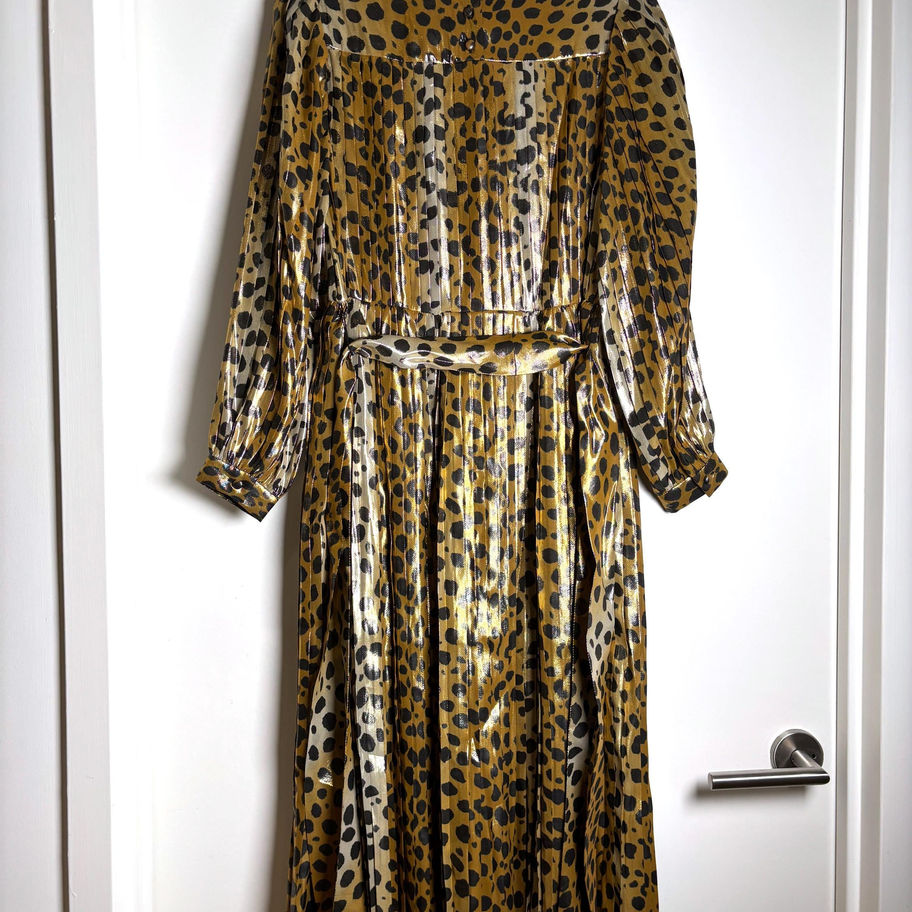 Step into the spotlight with this authentic Marc Jacobs runway piece — a show-stopping metallic maxi dress in bold leopard print. With dramatic long sleeves, a fitted waistline, and a flowing skirt finished with a statement bow, this gown is made to turn heads. Crafted with a luxurious gold lamé sheen, this rare designer dress evokes Studio 54-era decadence with a modern Y2K edge. Whether worn for a red carpet moment, gala, or holiday party, it exudes power, glamour, and true vintage runway flair. ✨ Style tip: Pair with sleek heels, a dramatic red lip, and a faux fur coat for a fierce evening look worthy of 2000s-era Vogue. 📏 Size: 2 (runs large). Oversized fit. 📏 Flat Measurements (inches): PTP 18" 🧵 Material: Metallic silk 🎨 Color: Gold, black, bronze 🖤 Condition: Pristine vintage condition. No visible flaws. Museum-worthy. A rare Marc Jacobs archival piece for collectors, stylists, and those who dress to make a statement. *All my items have been steam cleaned marc jacobs runway vintage designer dress metallic leopard gown holiday party dress editorial vintage statement evening dress y2k glam dress studio 54 style vintage marc jacobs luxury vintage fashion coquettecore glam animal print maxi dress designer vintage gown